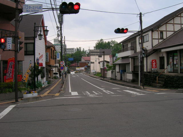 中央商店街通りの交差点にあるバスターミナル。ここら辺から温泉街という感じがするようになります。中央商店街通りにも宿や酒屋などがあります。 |